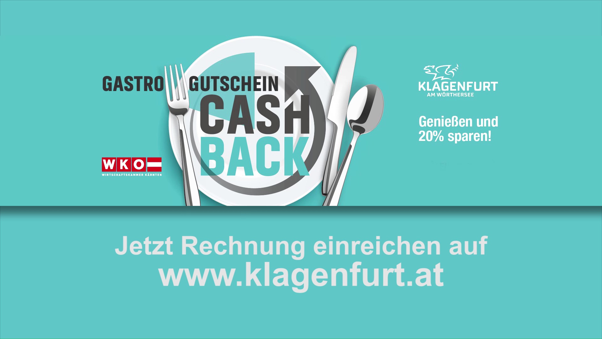 Mit der Gastro-Gutschein Cash-Back-Aktion der Landeshauptstadt Klagenfurt bekommen Sie 20% zurück. Einfach Rechnung unter www.klagenfurt.at einreichen.