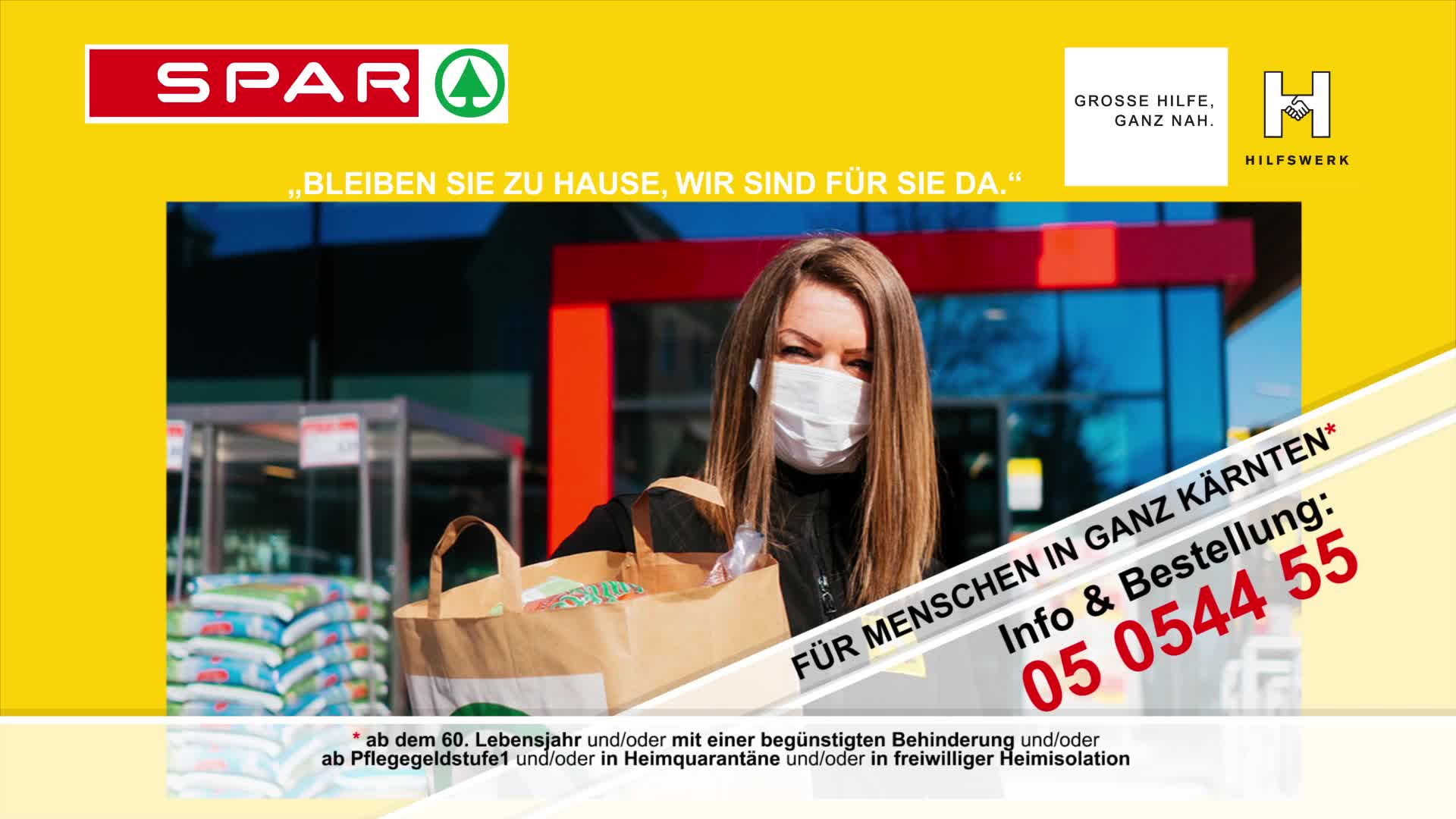 Bleiben Sie zu Hause – wir sind für Sie da. Beschaffungs- und Besorgungsdienst des Hilfswerks Kärnten in Kooperation mit Spar. Für Menschen in ganz Kärnten, ab dem 60. Lebensjahr und/oder mit einer begünstigten Behinderung und/oder ab Pflegestufe 1 und/oder in Heimquarantäne und/oder in freiwilliger Heimisolation.