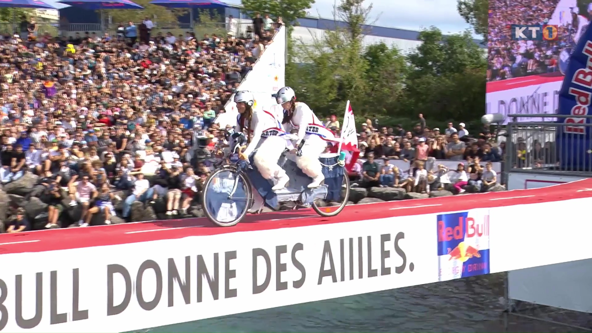 Beim Red Bull Tandem Splash steuern Zweierteams ein fantasievoll umgebautes Tandem über einen Hindernisparcours hoch über dem Wasser. Balance, Teamwork und originelle Ideen sind gefragt, um trocken die Zielplattform zu erreichen und die Glocke zu läuten. Die Veranstaltung in Lausanne begeisterte das Publikum mit farbenfrohen Tandems, witzigen Shows und actionreichen Momenten.